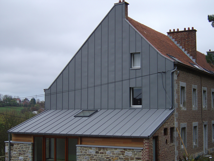 • De par son aspect unique, les façades en zinc offrent une plus-value indéniable au bâtiment. Sa grande longévité et son absence d’entretien en font un produit intemporel et pourtant original. On distingue deux techniques : les joints debouts, qui peut être utilisé pour l’habillage des formes cintrées, droites ou complexes. Les bandes peuvent être posées horizontalement ou verticalement. Le profil à emboitement, quant à lui, est un bardage ventilé qui se pose horizontal ou vertical. La fixation se fait sur un lattage en bois ou métallique. Les profils sont faits sur mesure.