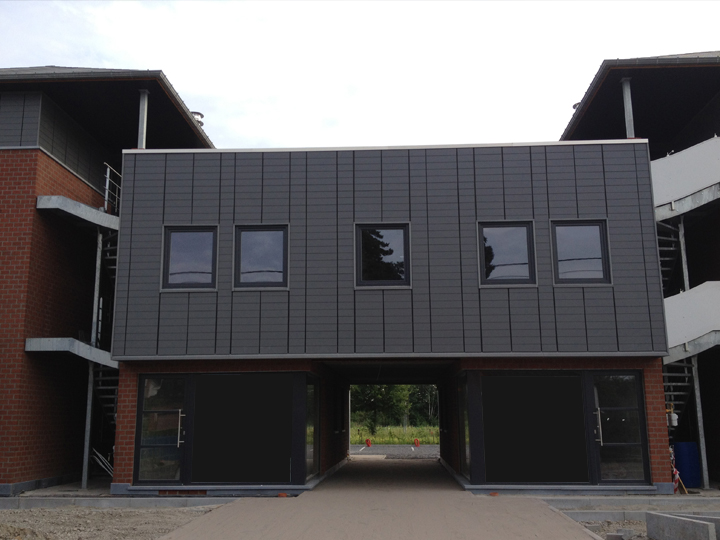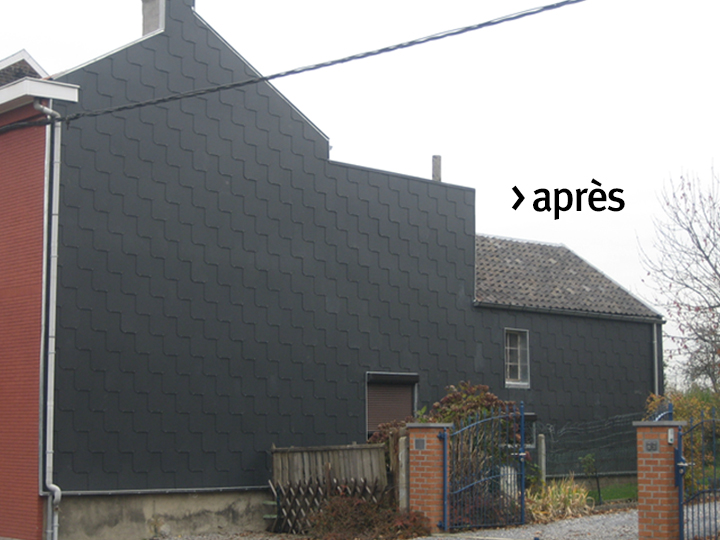 • La pose de panneaux Eternit (Natura, Etercolor, Sidings,…). Avec de multiples variations dans le fini de surface, la gamme de ces panneaux offre haute performance, esthétisme et également une résistance unique aux impacts et rayures. Leur aspect minéral s’accentue au gré de la lumière et rend un réel aspect naturel de la matière. Ce type de panneaux s’intègre parfaitement dans une architecture épurée et convient pour des commerces, des équipements publics et/ou industriels, des maisons individuelles,…